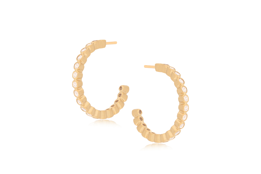BRINCO EM PRATA, ARGOLINHA MEIA CRAVEJADA 12,50mm DIÂMETRO, COM CORAÇÃO LISO