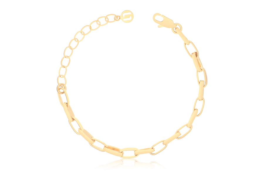 PULSEIRA BANHADA EM OURO, CORRENTE ELO OVAL 11,50x5,50mm, 17cm COMPRIMENTO, EXTENSOR 5cm E PESO 8,50g