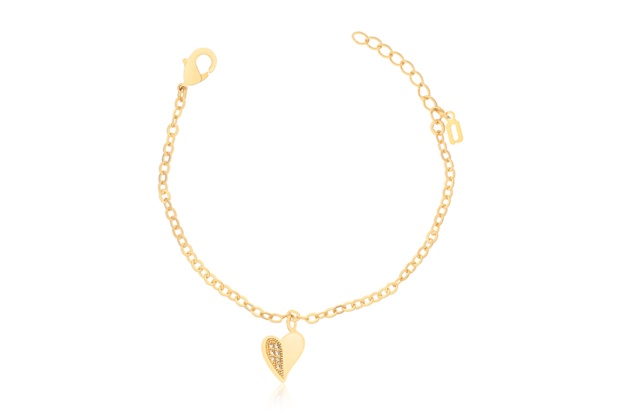 PULSEIRA BANHADA EM OURO, INFANTIL, ELO OVAL 2,30mm LARGURA, 13cm COMPRIMENTO, EXTENSOR 3cm COMPRIMENTO E CORAÇÃO 8mm LARGURA